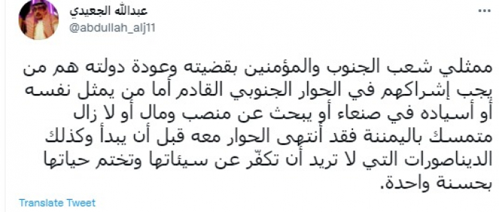 وقال في تغريدة عبر "تويتر" رصدها "المشهد العربي": "ممثلي شعب الجنوب والمؤمنين بقضيته وعودة دولته هم من يجب إشراكهم في الحوار الجنوبي القادم".