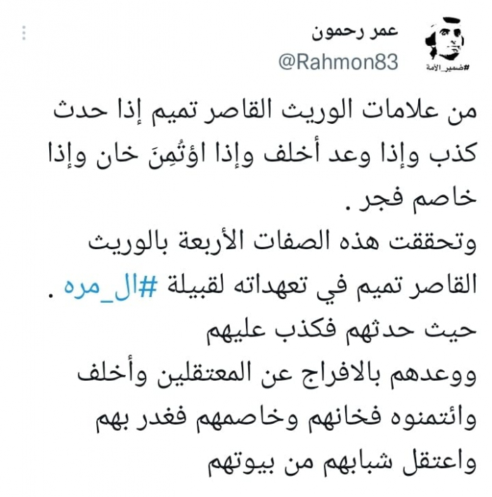 وأكد أنه: "تحققت هذه الصفات الأربع بالوريث القاصر تميم في تعهداته لقبيلة آل مرة.