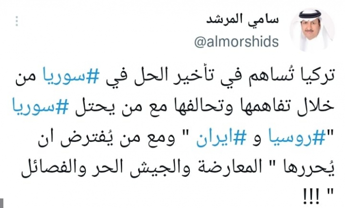 حمل المحلل السياسي السعودي سامي المرشد، النظام التركي المسؤولية عن تأخير حل الأزمة السورية.