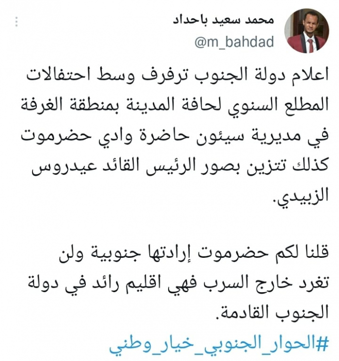 وكشف في تغريدة على حسابه بموقع التدوين المصغر تويتر، اليوم أن: "أعلام دولة الجنوب ترفرف وسط احتفالات المطلع السنوي لحافة المدينة بمنطقة الغرفة في مديرية سيئون، حاضرة وادي حضرموت كذلك تتزين بصور الرئيس القائد عيدروس الزُبيدي".