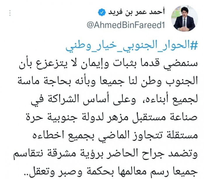 وقال في تغريدة على حسابه بموقع التدوين المصغر تويتر، اليوم: "الحوار الجنوبي خيار وطني، سنمضي قدما بثبات وإيمان لا يتزعزع بأن الجنوب وطن لنا جميعا وبأنه بحاجة ماسة لجميع أبنائه".