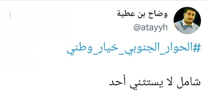 وأوضح في تغريدة على حسابه بموقع التدوين المصغر تويتر، اليوم أن: "الحوار الجنوبي خيار وطني شامل لا يستثني أحدا".