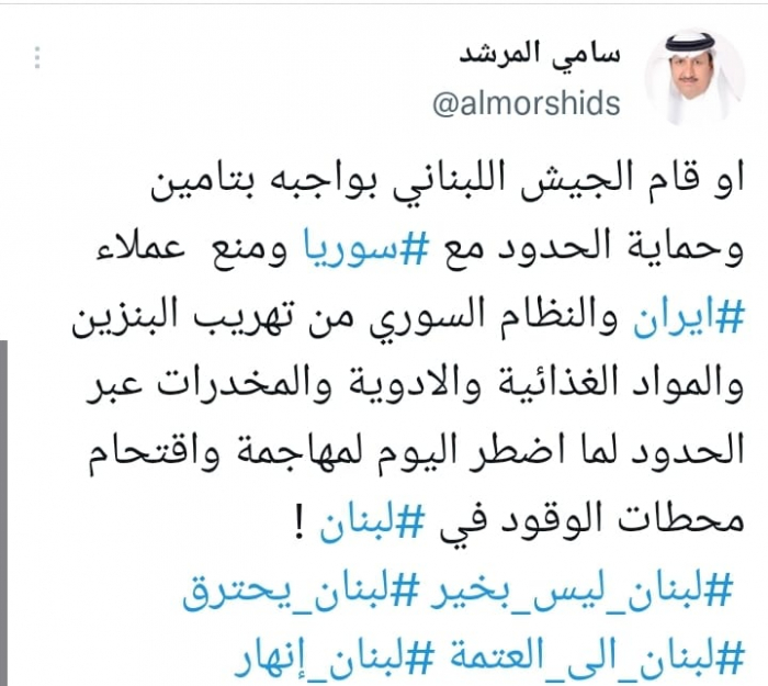 وأشار في تغريدة على حسابه بموقع التدوين المصغر تويتر، اليوم إلى أنه: "لو قام الجيش اللبناني بواجبه بتأمين وحماية الحدود مع سوريا ومنع عملاء إيران والنظام السوري من تهريب البنزين والمواد الغذائية والأدوية والمخدرات عبر الحدود لما اضطر اليوم لمهاجمة واقتحام محطات الوقود في لبنان".