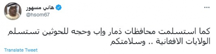 وكتب في تغريدة عبر "تويتر" رصدها "المشهد العربي": "كما استسلمت محافظات ذمار وإب وحجة للحوثيين تستسلم الولايات الأفغانية .. وسلامتكم".