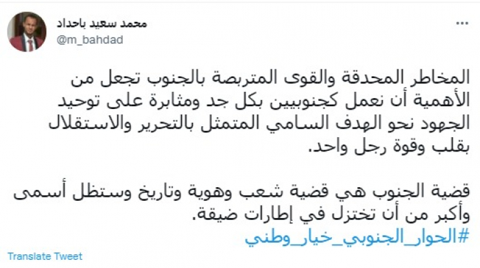 واختتم تغريدته بهاشتاج: "الحوار الجنوبي خيار وطني".