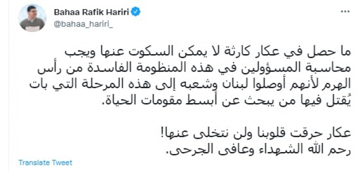 دعا السياسي اللبناني البارز بهاء الحريري، اليوم الأحد، إلى مُحاسبة المنظومة السياسية في لبنان، بعد كارثة عكار، كما طالب بالاتحاد لإنقاذ المتضررين من إخفاقات السلطة.