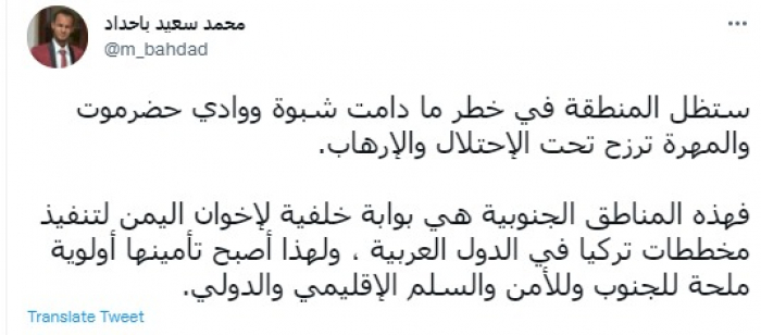 دعا الناشط السياسي محمد سعيد باحداد، اليوم الاثنين، إلى تأمين شبوة ووادي حضرموت والمهرة، وذلك بعد أن أصبحت أداة لجماعة الإخوان الإرهابية في اليمن لتنفيذ مُخططات تركيا.