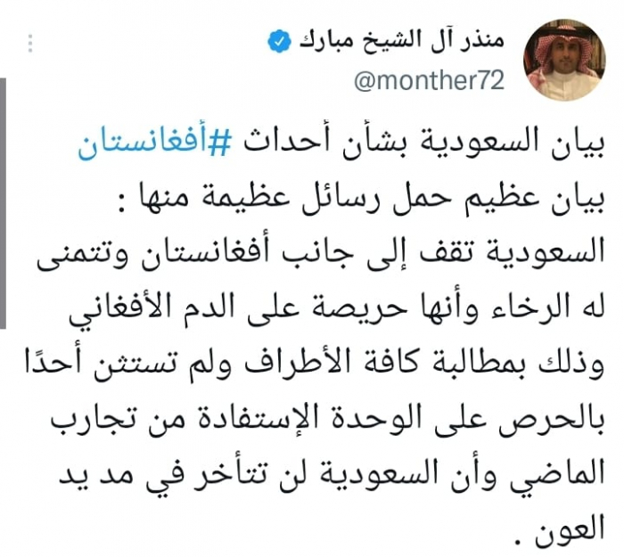 واعتبر في تغريدة على حسابه بموقع التدوين المصغر تويتر، اليوم أن: "بيان السعودية بشأن أحداث أفغانستان بيان عظيم حمل رسائل عظيمة".