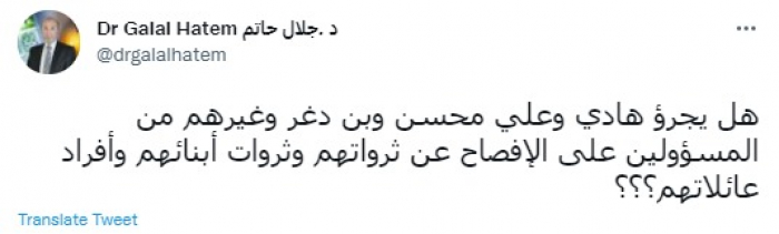 وقال في تغريدة عبر "تويتر" رصدها "المشهد العربي": "هل يجرؤ هادي وعلي محسن وبن دغر وغيرهم من المسؤولين على الإفصاح عن ثرواتهم وثروات أبنائهم وأفراد عائلاتهم؟".