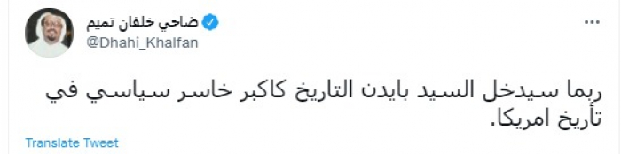 وقال في تغريدة عبر "تويتر" رصدها "المشهد العربي": "ربما سيدخل السيد بايدن التاريخ كأكبر خاسر سياسي في تاريخ أمريكا".