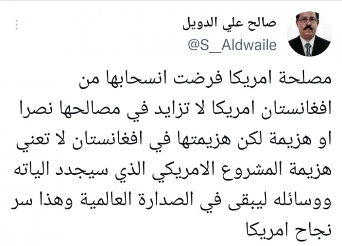 ورأى في تغريدة على حسابه بموقع التدوين المصغر تويتر، اليوم أن: "مصلحة أمريكا فرضت انسحابها من أفغانستان".