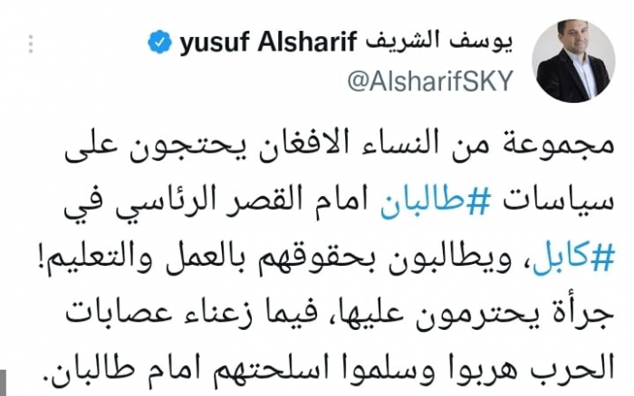 وأوضح في تغريدة على حسابه بموقع التدوين المصغر تويتر، اليوم أن هناك: "مجموعة من النساء الأفغان يحتجون على سياسات طالبان أمام القصر الرئاسي في كابل، ويطالبون بحقوقهم بالعمل والتعليم".