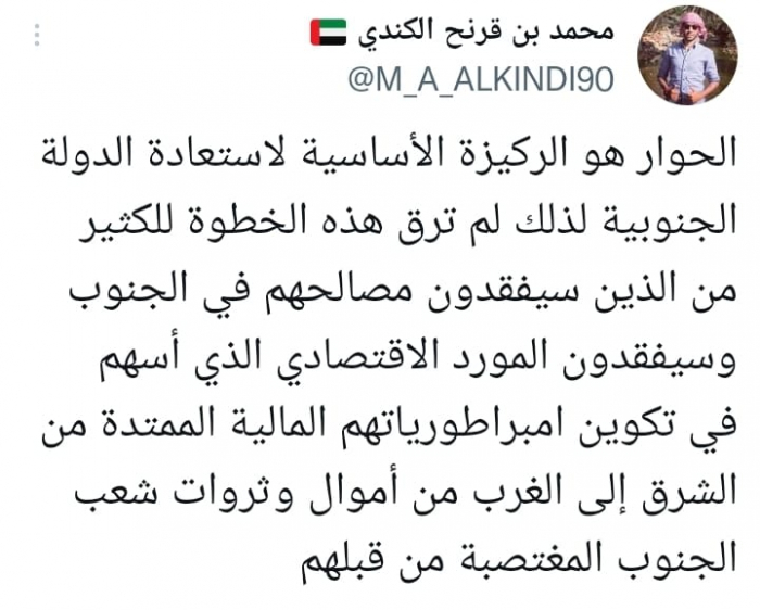 وشدد في تغريدة على حسابه بموقع التدوين المصغر تويتر اليوم على أن: "الحوار هو الركيزة الأساسية لاستعادة الدولة الجنوبية".