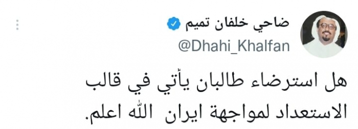 وتساءل في تغريدة على حسابه بموقع التدوين المصغر تويتر اليوم: "هل استرضاء طالبان يأتي في قالب الاستعداد لمواجهة إيران، الله اعلم".