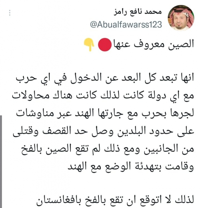 ورأى أنه: " لذلك كانت هناك محاولات لجرها بحرب مع جارتها الهند عبر مناوشات على حدود البلدين وصل حد القصف وقتلى من الجانبين ومع ذلك لم تقع الصين بالفخ وقامت بتهدئة الوضع مع الهند"، موضحا: "لذلك لا أتوقع أن تقع بالفخ بأفغانستان".