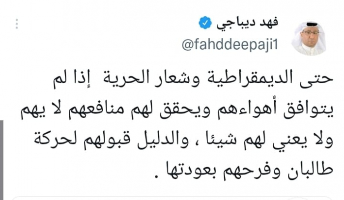 وقال في تغريدة على حسابه بموقع التدوين المصغر تويتر، اليوم إن: "حتى الديمقراطية وشعار الحرية إذا لم يتوافق مع أهواءهم ويحقق لهم منافعهم لا يهم ولا يعني لهم شيئا"، مختتما: "الدليل قبولهم لحركة طالبان وفرحهم بعودتها".