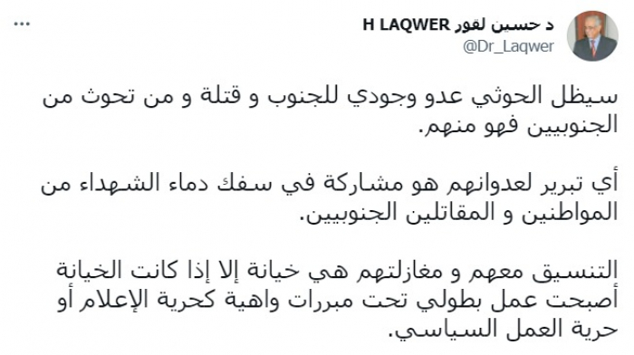 وكشف أن: "أي تبرير لعدوانهم هو مشاركة في سفك دماء الشهداء من المواطنين و المقاتلين الجنوبيين"، متابعا: "التنسيق معهم و مغازلتهم هي خيانة إلا إذا كانت الخيانة أصبحت عمل بطولي تحت مبررات واهية كحرية الإعلام أو حرية العمل السياسي".