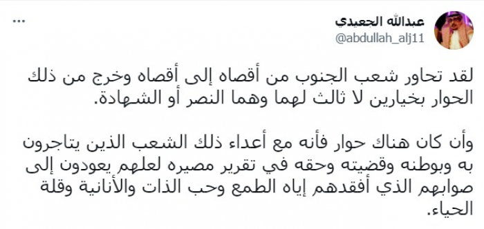 وأكد في تغريدة على حسابه بموقع تويتر، اليوم الخميس، أنه: "تحاور شعب الجنوب من أقصاه إلى أقصاه وخرج من ذلك الحوار بخيارين لا ثالث لهما وهما النصر أو الشهادة".