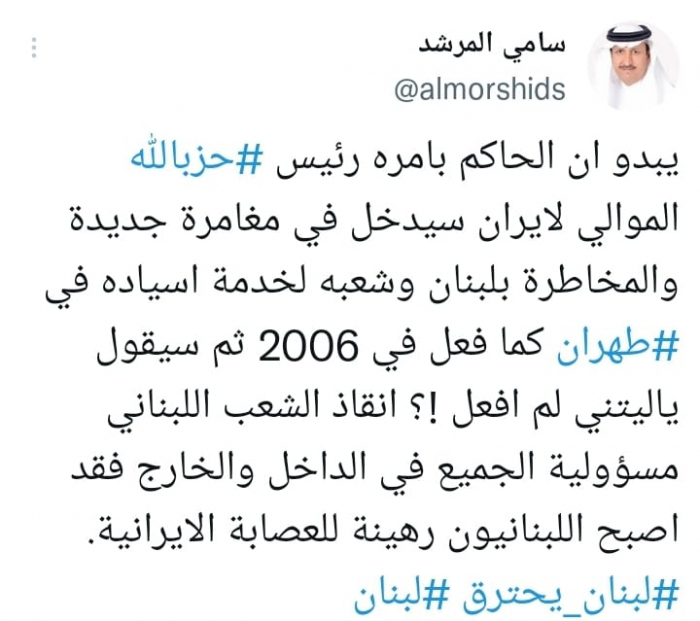 وأوضح في تغريدة على حسابه بموقع التدوين المصغر تويتر، اليوم أنه: "يبدو أن الحاكم بأمره رئيس حزب الموالي لإيران سيدخل في مغامرة جديدة والمخاطرة بلبنان وشعبه لخدمة أسياده في طهران".
