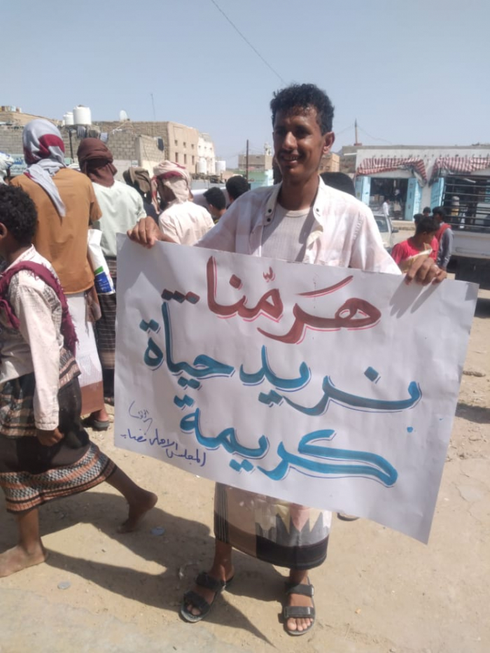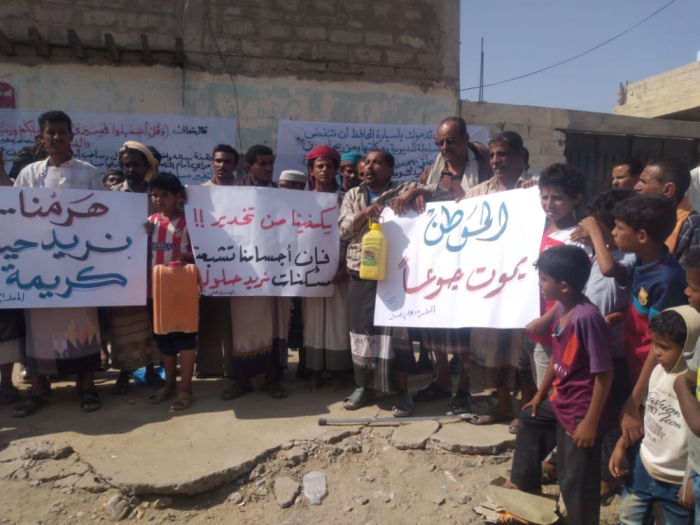 وندد المتظاهرون بتدمير مليشيات الشرعية الإخوانية للخدمات الأساسية، وتغييب مقومات الحياة، وتأزيم الظروف المعيشية للمواطنين انتقامًا من رفضهم وجودها بالمحافظة.