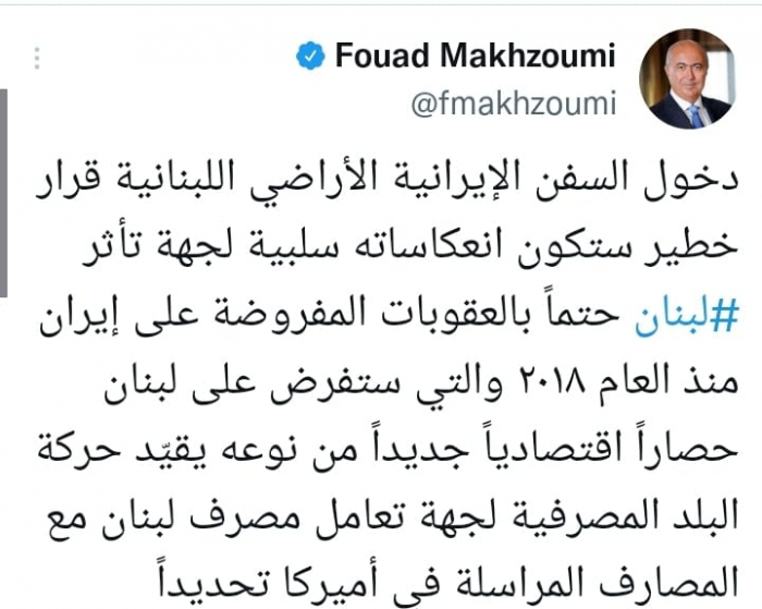 وشدد في تغريدة على حسابه بموقع التدوين المصغر تويتر، اليوم على أن: "دخول السفن الإيرانية الأراضي اللبنانية قرار خطير ستكون انعكاساته سلبية لجهة تأثر لبنان حتما بالعقوبات المفروضة على إيران منذ العام 2018".
