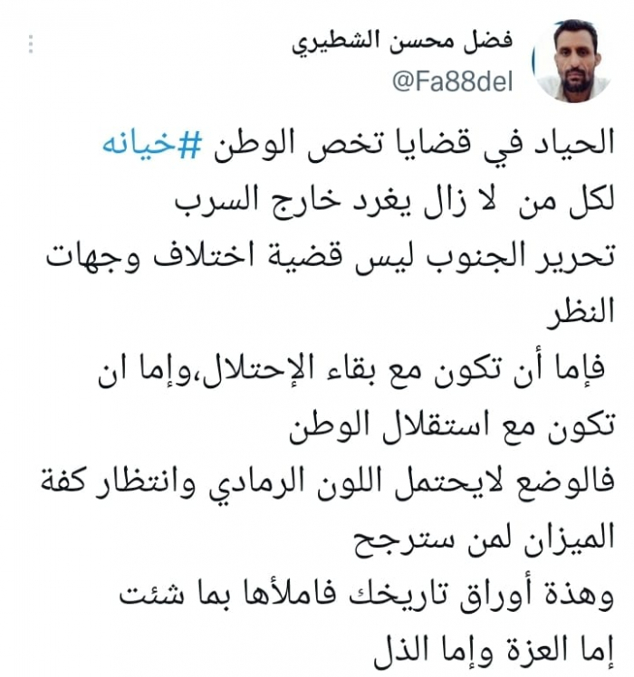 ووجه حديثه: "لكل من لا زال يغرد خارج السرب"، قائلا: "تحرير الجنوب ليس قضية اختلاف وجهات النظر فإما أن تكون مع بقاء الاحتلال، وإما أن تكون مع استقلال الوطن فالوضع لا يحتمل اللون الرمادي وانتظار كفة الميزان لمن سترجح وهذة أوراق تاريخك فاملأها بما شئت إما العزة وإما الذل".