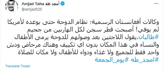 وكتب في تغريدة عبر "تويتر" رصدها "المشهد العربي": "وكالات أفغانستان الرسمية؛ نظام الدوحة حتى بوعده لأمريكا لم يوفي! أصبحت قطر سجن لكل الهاربين من جحيم طالبان".
