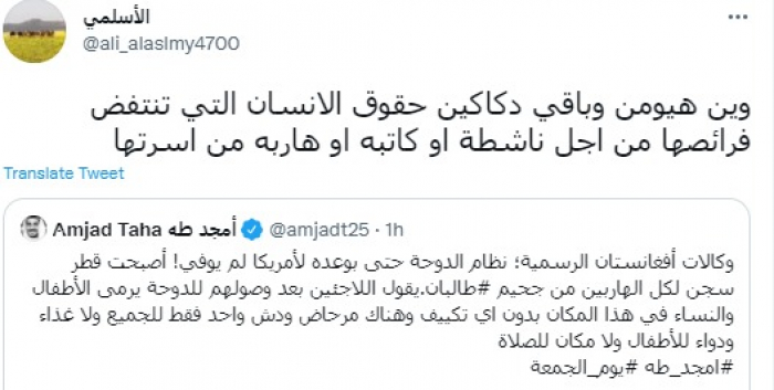 جاء ذلك في مجمل رده على تغريدة للرئيس الإقليمي للمركز البريطاني لدراسات وأبحاث الشرق الأوسط أمجد طه، أكد خلالها أن قطر أصبحت سجن لكل الهاربين من جحيم حركة طالبان بأفغانستان.