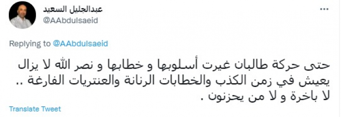 وتابع: "حتى حركة طالبان غيرت أسلوبها وخطابها و نصر الله لا يزال يعيش في زمن الكذب والخطابات الرنانة والعنتريات الفارغة.. لا باخرة ولا من يحزنون".