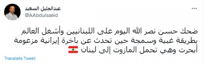 وقال في تغريدة عبر "تويتر" رصدها "المشهد العربي": "ضحك حسن نصر الله اليوم على اللبنانيين وأشغل العالم بطريقة غبية وسمجة حين تحدث عن باخرة إيرانية مزعومة أبحرت وهي تحمل المازوت إلى لبنان".