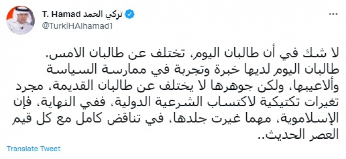 وكتب في تغريدة عبر "تويتر" رصدها "المشهد العربي": "لا شك في أن طالبان اليوم، تختلف عن طالبان الأمس. طالبان اليوم لديها خبرة وتجربة في ممارسة السياسة وألاعيبها، ولكن جوهرها لا يختلف عن طالبان القديمة، مجرد تغيرات تكتيكية لاكتساب الشرعية الدولية".