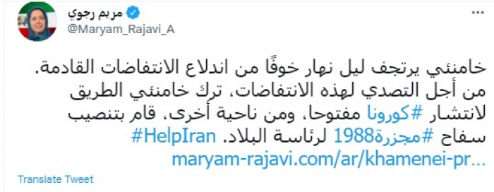 وقالت في تغريدة عبر "تويتر" رصدها "المشهد العربي": "خامنئي يرتجف ليل نهار خوفًا من اندلاع الانتفاضات القادمة. من أجل التصدي لهذه الانتفاضات، ترك خامنئي الطريق لانتشار كورونا مفتوحا، ومن ناحية أخرى، قام بتنصيب سفاح مجزرة 1988 لرئاسة البلاد".