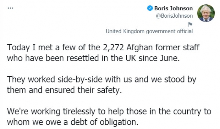 وقال في تغريدة على حسابه بموقع التدوين المصغر تويتر، إنني: "التقيت اليوم بعدد قليل من الموظفين الأفغان السابقين البالغ عددهم 2272 موظفًا والذين أعيد توطينهم في المملكة المتحدة منذ يونيو".