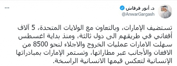 وتابع: "منذ بداية أغسطس سهلت الإمارات عمليات الخروج والإجلاء لنحو 8500 من الأفغان والأجانب عبر مطاراتها"، مشددا على أنه: "تستمر الإمارات بمبادراتها الإنسانية لتعكس قيمها الإنسانية الراسخة".