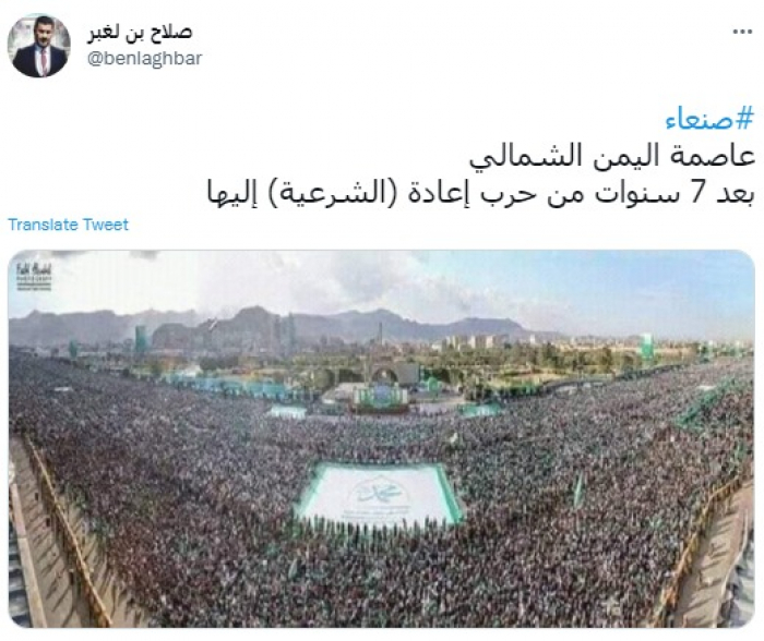 وقال في تغريدة عبر "تويتر" رصدها "المشهد العربي": "صنعاء.. عاصمة اليمن الشمالي.. بعد 7 سنوات من حرب إعادة (الشرعية) إليها".