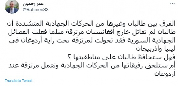وقال في تغريدة عبر "تويتر" رصدها "المشهد العربي": "الفرق بين طالبان وغيرها من الحركات الجهادية المتشددة أن طالبان لم تقاتل خارج أفغانستان مرتزقة مثلما فعلت الفصائل الجهادية السورية فقد تحولت لمرتزقة تحت راية أردوغان في ليبيا وأذربيجان".