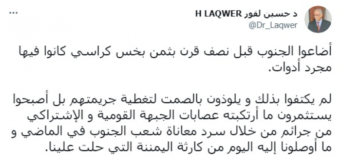 وشدد في تغريدة على حسابه بموقع التدوين المصغر تويتر، اليوم على أنهم: "أضاعوا الجنوب قبل نصف قرن بثمن بخس كراسي كانوا فيها مجرد أدوات".