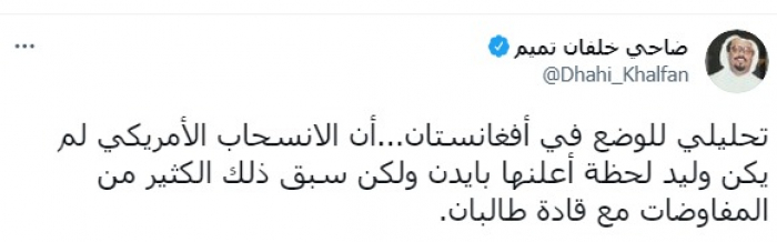 أكد نائب مدير الشرطة والأمن العام في دبي الفريق ضاحي خلفان، أن الانسحاب الأمريكي من أفغانستان ليس مفاجئ، وإنما سبقه مفاوضات طويلة مع حركة طالبان.