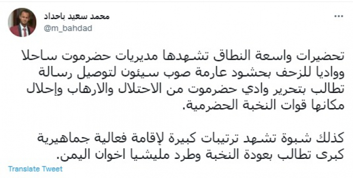 وقال في تغريدة عبر "تويتر" رصدها "المشهد العربي": "تحضيرات واسعة النطاق تشهدها مديريات حضرموت ساحلا وواديا للزحف بحشود عارمة صوب سيئون لتوصيل رسالة تطالب بتحرير وادي حضرموت من الاحتلال والإرهاب وإحلال مكانها قوات النخبة الحضرمية".
