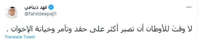 وقال في تغريدة عبر "تويتر" رصدها "المشهد العربي": "لا وقتَ للأوطان أن تصبر أكثر على حقد وتآمر وخيانة الإخوان".