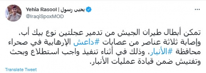 وقال في تغريدة عبر "تويتر" رصدها "المشهد العربي": "تمكن أبطال طيران الجيش من تدمير عجلتين نوع بيك أب، وإصابة 3 عناصر من عصابات داعش الإرهابية في صحراء محافظة الأنبار، وذلك في أثناء تنفيذ واجب استطلاع وبحث وتفتيش ضمن قيادة عمليات الأنبار".