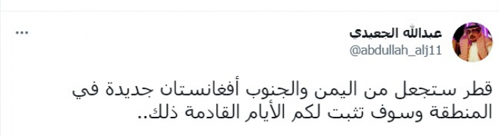 وشدد في تغريدة على حسابه بموقع التدوين المصغر تويتر، اليوم على أن: "قطر ستجعل من اليمن والجنوب أفغانستان جديدة في المنطقة وسوف تثبت لكم الأيام القادمة ذلك".