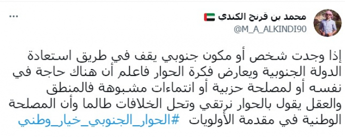 وأكد في تغريدة على حسابه بموقع التدوين المصغر تويتر، اليوم أنه: "إذا وجدت شخص أو مكون جنوبي يقف في طريق استعادة الدولة الجنوبية ويعارض فكرة الحوار فاعلم أن هناك حاجة في نفسه أو لمصلحة حزبية أو انتماءات مشبوهة".