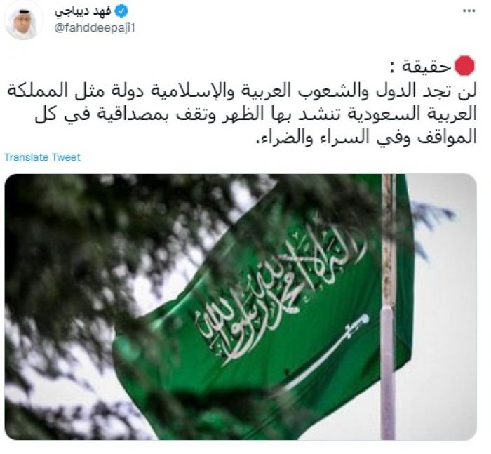 وقال في تغريدة عبر "تويتر" رصدها "المشهد العربي": "حقيقة: لن تجد الدول والشعوب العربية والإسلامية دولة مثل المملكة العربية السعودية تنشد بها الظهر وتقف بمصداقية في كل المواقف وفي السراء والضراء".