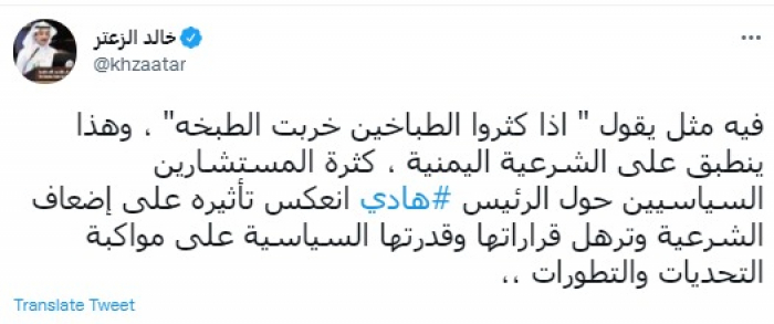 وكتب في تغريدة عبر "تويتر" رصدها "المشهد العربي": "في مثل يقول إذا كثروا الطباخين خربت الطبخة، وهذا ينطبق على الشرعية اليمنية".