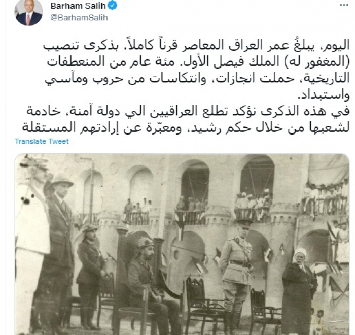 وكتب في تغريدة عبر "تويتر" رصدها "المشهد العربي": "اليوم، يبلغُ عمر العراق المعاصر قرناً كاملاً. بذكرى تنصيب (المغفور له) الملك فيصل الأول. مئة عام من المنعطفات التاريخية، حملت انجازات، وانتكاسات من حروب ومآسي واستبداد".