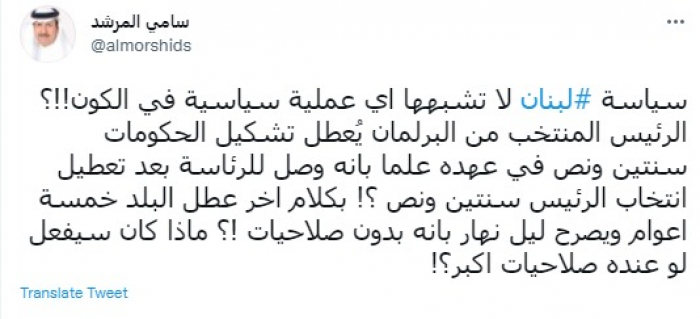 وقال في تغريدة عبر "تويتر" رصدها "المشهد العربي": "سياسة لبنان لا تشبهها اي عملية سياسية في الكون!.. الرئيس المنتخب من البرلمان يُعطل تشكيل الحكومات سنتين ونص في عهده علما بأنه وصل للرئاسة بعد تعطيل انتخاب الرئيس سنتين ونص؟".