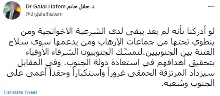 واختتم: "وفي المقابل سيزداد المرتزقة الحمقى غرورًا واستكبارًا وحقدًا أعمى على الجنوب وشعبه".