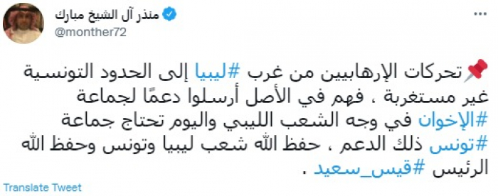 وصف المدون السعودي البارز منذر آل الشيخ مبارك، اليوم الاثنين، تحركات العناصر الإرهابية من غرب ليبيا نحو حدود تونس بالغير مستغربة، مستنكرًا دعم جماعة الإخوان في ليبيا لحركة النهضة التونسية.