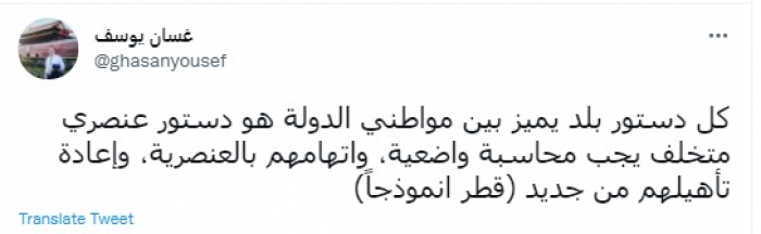 وقال في تغريدة عبر "تويتر" رصدها "المشهد العربي": "كل دستور بلد يميز بين مواطني الدولة هو دستور عنصري متخلف يجب محاسبة واضعية، واتهامهم بالعنصرية، وإعادة تأهيلهم من جديد (قطر نموذجا)".